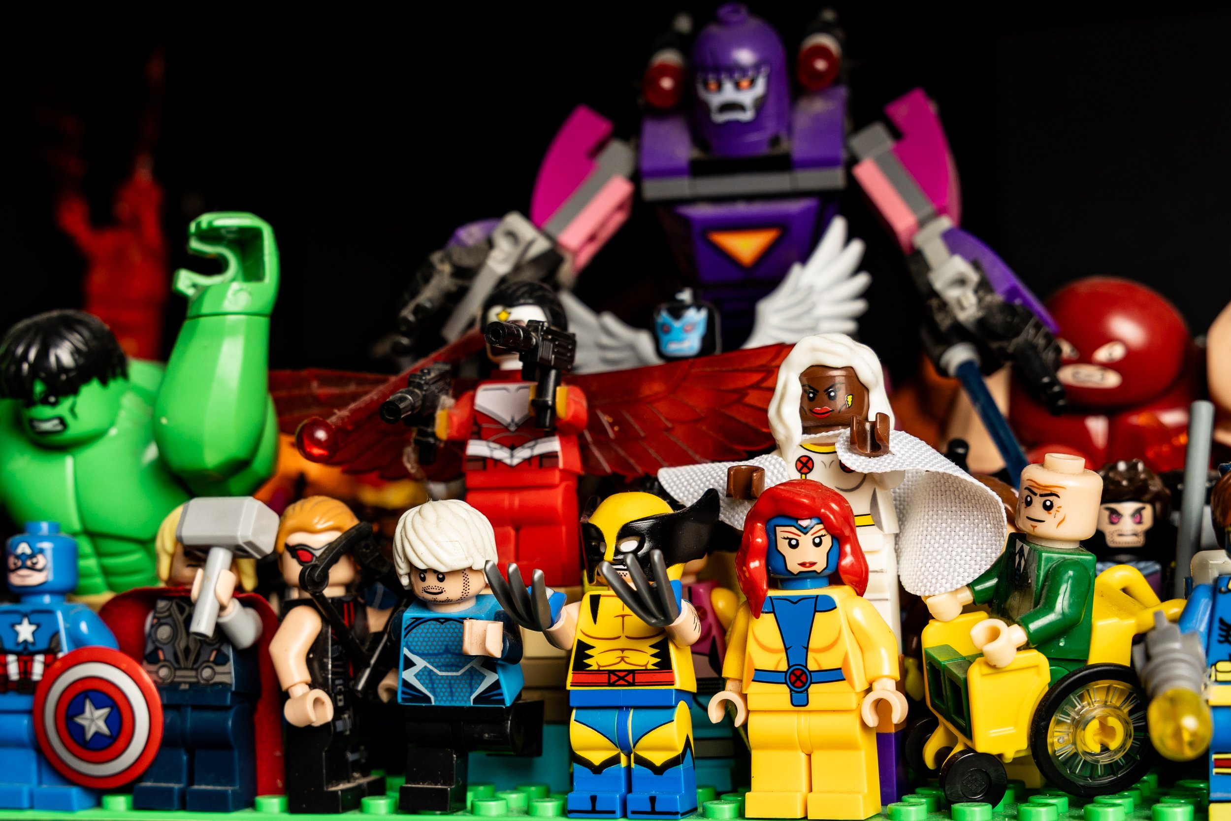 Beside him are an assortment of heroes: Captain America, Spider-Man, Cyclops and the rest of the X-Men. Plus a curated cast of characters from the Marvel and DC universes. They line the wall like sentinels, a colorful and carefully composed panorama of comic mythology.