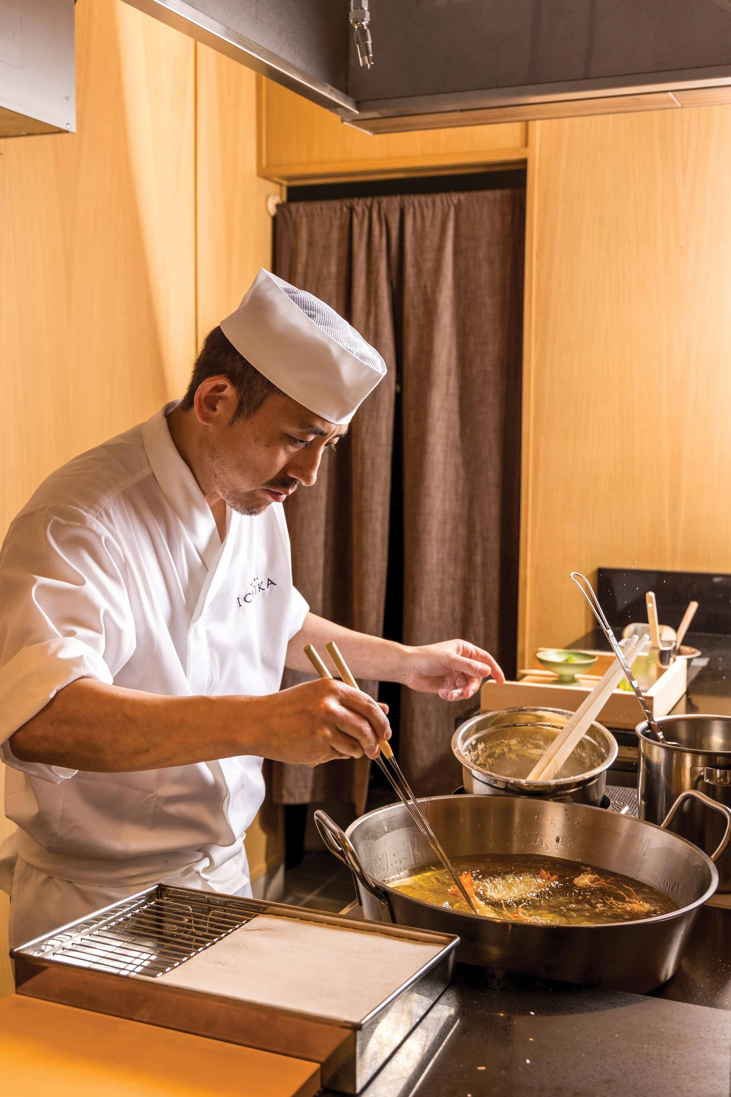 The 12-seat counter restaurant transports diners to an intimate venue evocative of Azabujuban, revealing blonde oak counters, creamy textured walls, and an open frying station lined with a copper splash guard. Chaste Japanese design elements such as ceramic objets d’art and a recessed lower wall displaying a miniature garden contribute to its Zen-like charm. Establishing a context of neutrality and serenity, the focus organically shifts to the cuisine, where each course feels like a meticulously crafted oeuvre expressing quiet sophistication that pays reverence to the importance of minutiae.