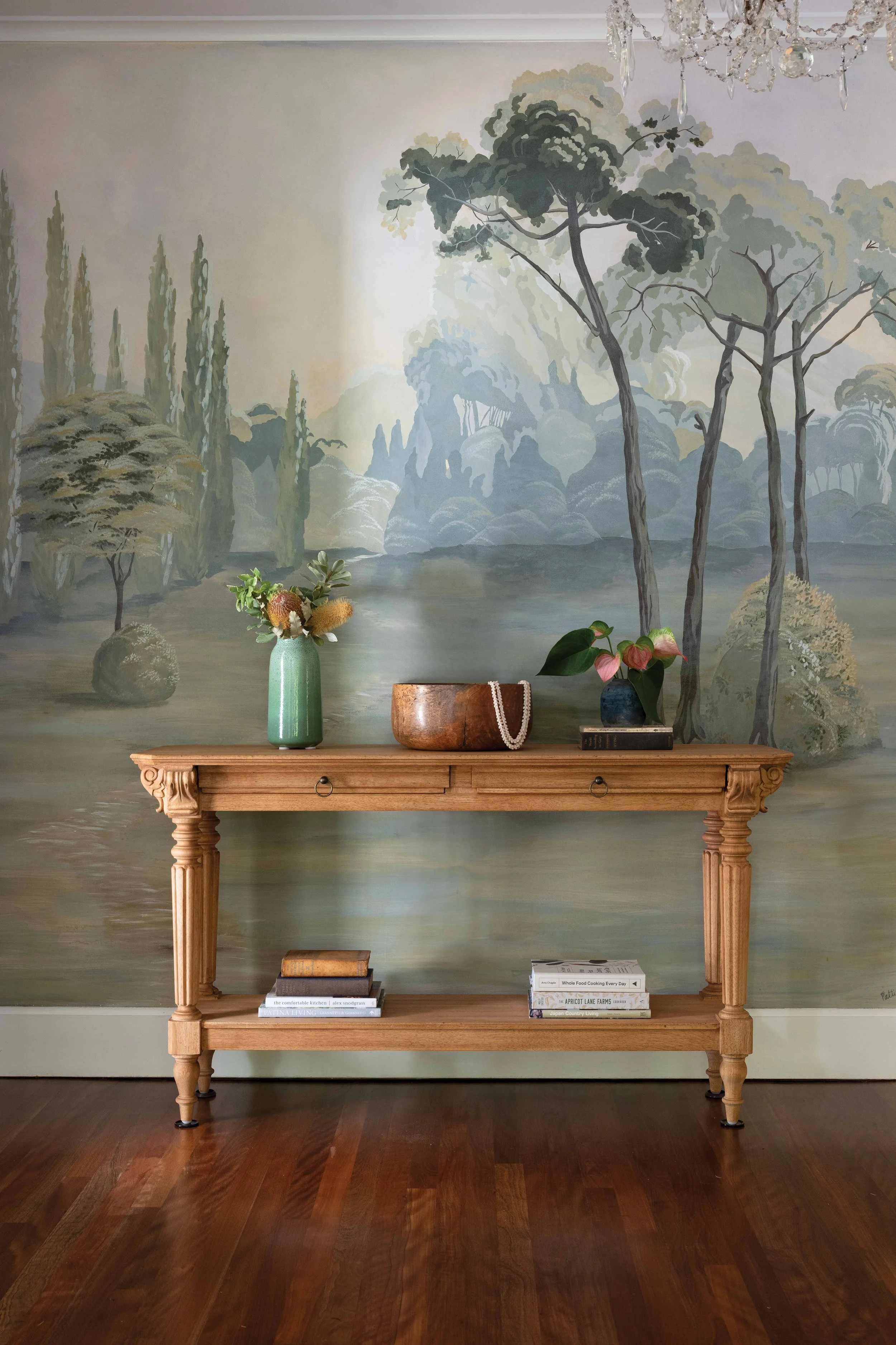 The home’s entry blends vintage floors with hand-painted murals.