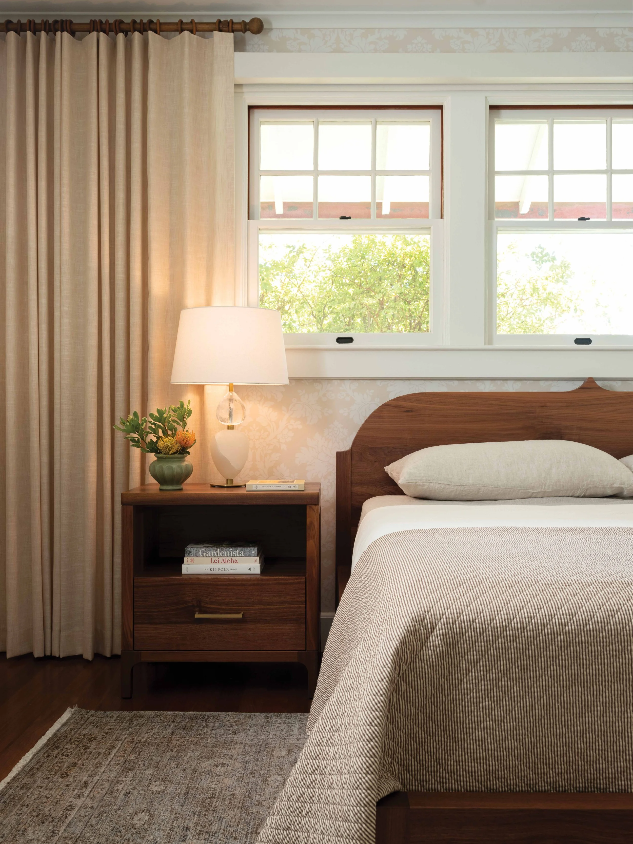 Hearing that, Jasina chimes in with some of the specs and touches that stand out: “This powder room’s Tadelakt [traditional Moroccan lime plaster] walls have a hand-painted mural that was refined until it matched the sink,” and, moving down a room or two, “this bed and the matching side tables were custom-made by Rust & Root, who make bespoke furniture in Kapolei.”
