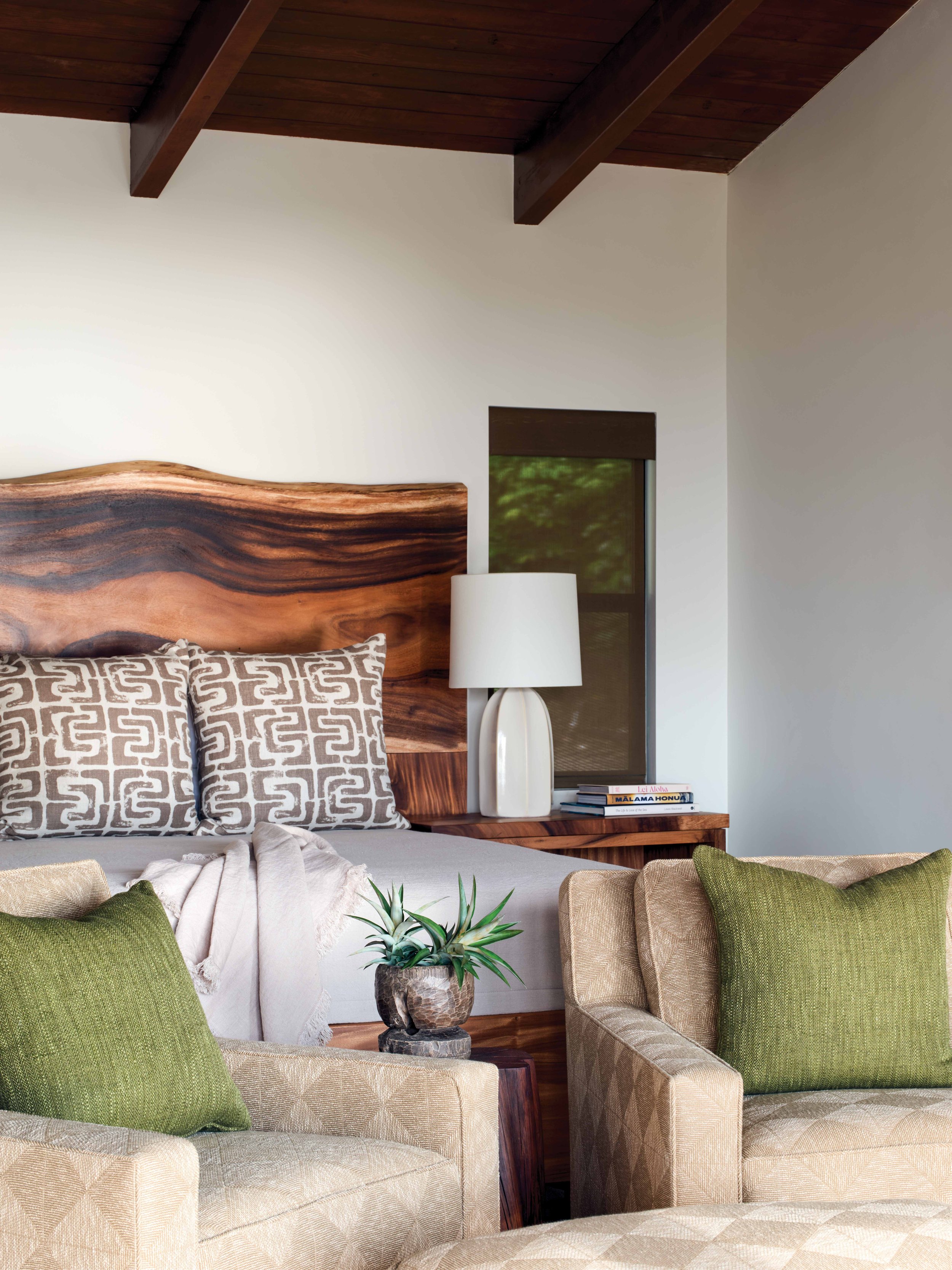 …to bedrooms furnished with custom pieces by Big Island–based Wilkinson Woodworks.