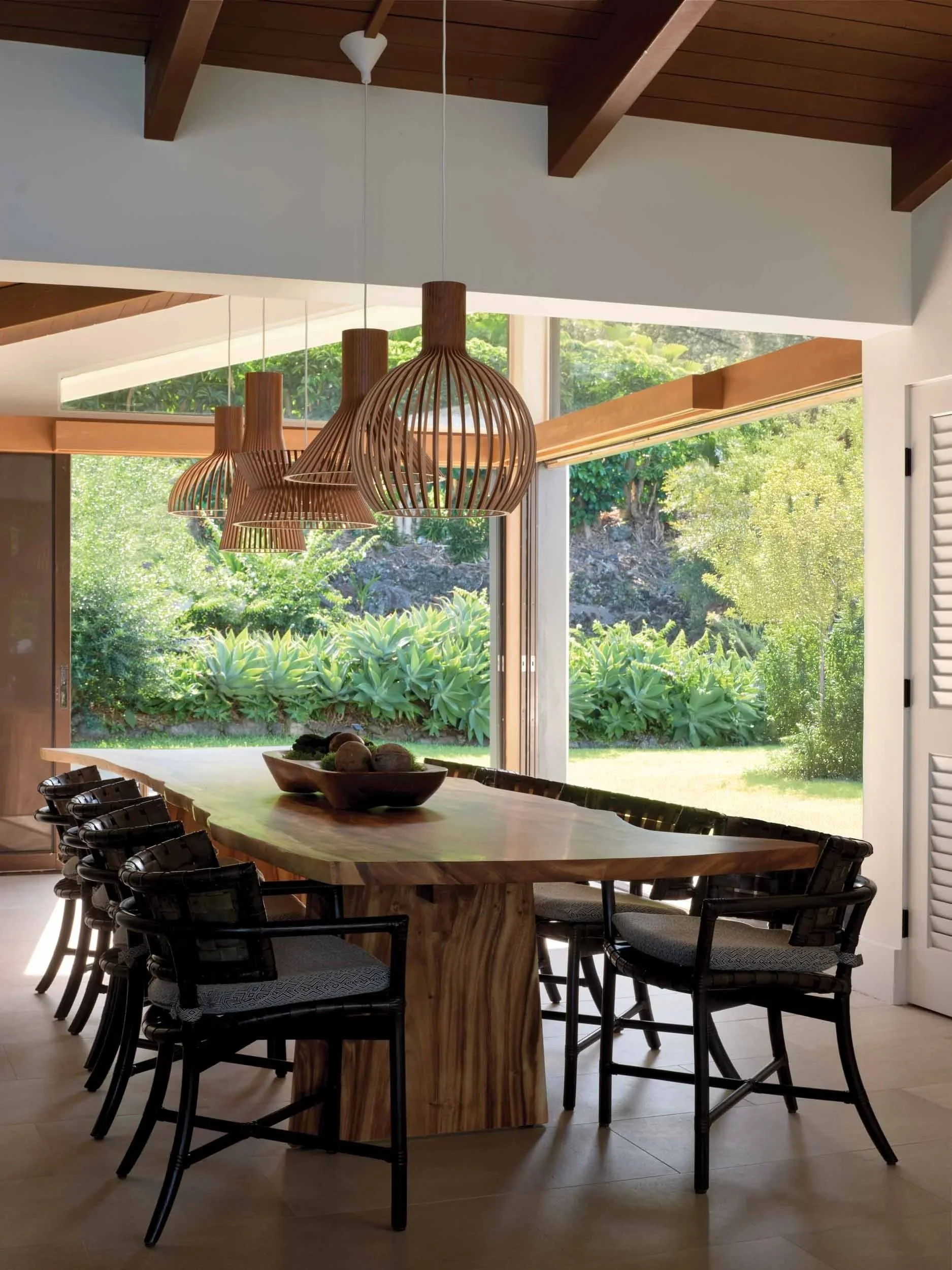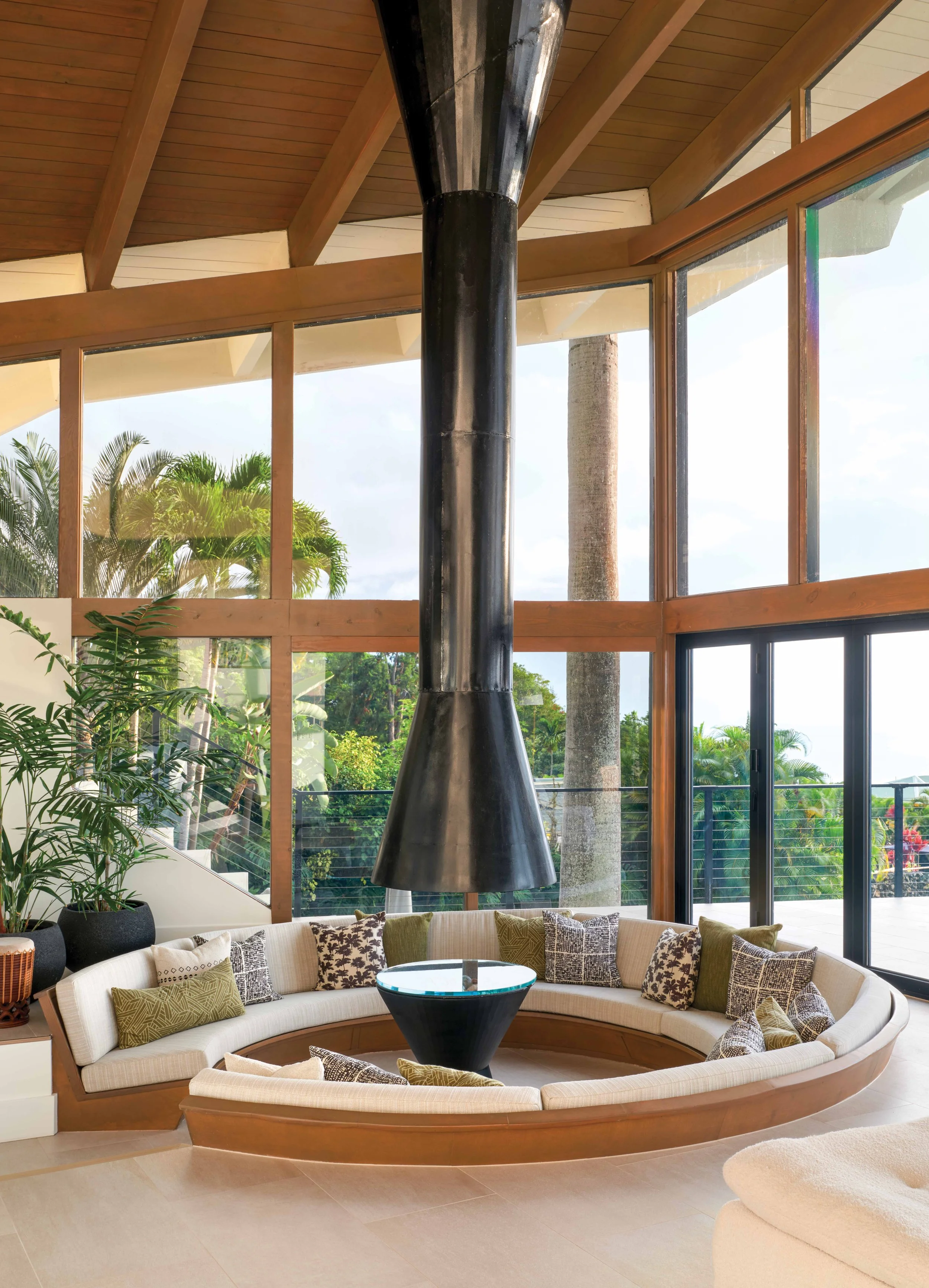 During the day, the expanse of floor-to-glass reveals a horizon-wide view of the ocean below, bathing the original circular conversation pit in dappled sunlight. In the evening, wood-rib pendants from Secto hanging over the monkeypod slab dining table cast a warm glow across the open kitchen. Beyond, an instantly recognizable painting of a woman in kapa by Yvonne Cheng leads the eye to an actual kapa piece sourced from renowned Kamuela artist Roen Hufford.