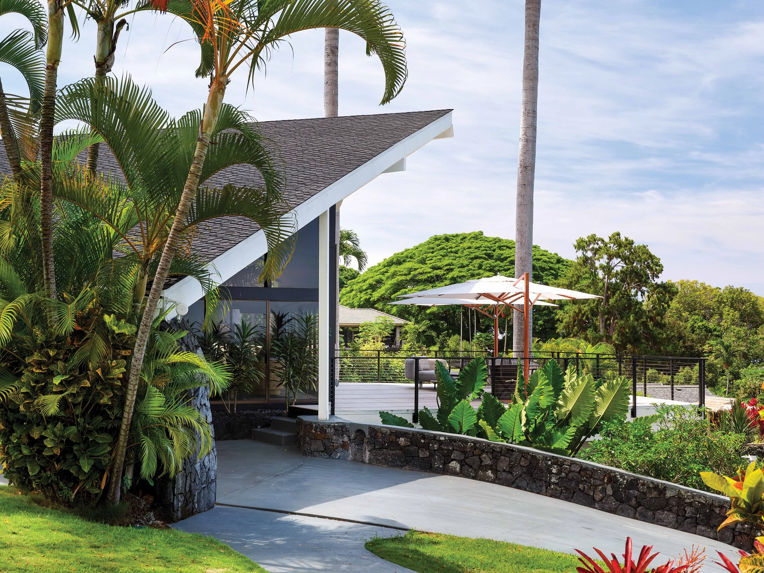Nestled on the lower slopes of Mount Hualālai in the southwestern corner of Holualoa is a quiet neighborhood overlooking Kona town. It is there, up a quiet, meandering street with no exit, that one finds this mid-century gem originally built in the late 1960s. From afar, its striking façade of angular windows rising into the sharp roofline is the first clue that this isn’t just another low-pitched, open-gable example of the genre. With towering Royal palms and expansive monkeypod trees, one senses that this home has been a special spot from its earliest days.